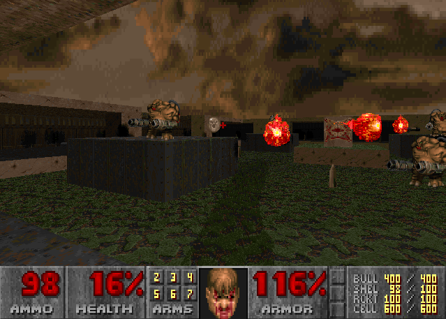 There were many memorable combat sections where id really showed off how talented they are when it comes to creating fun and interesting firefights. The one that comes to my mind is Doom II's seventh level: Dead Simple or MAP07. This level was one of the most memorable levels in Doom II because it introduced two new enemies to the series. They were the Mancubus and Arachnotron. However, the combat really shined by the well and proper placements of these enemies and it had somewhat of an arena feel to like going into a gladiator arena. Once you kill the all the Mancubi, the game surprises you by throwing an abundance amount of Arachnotrons to keep you on your toes again. There were many of these kinds of great combat throughout Doom II.